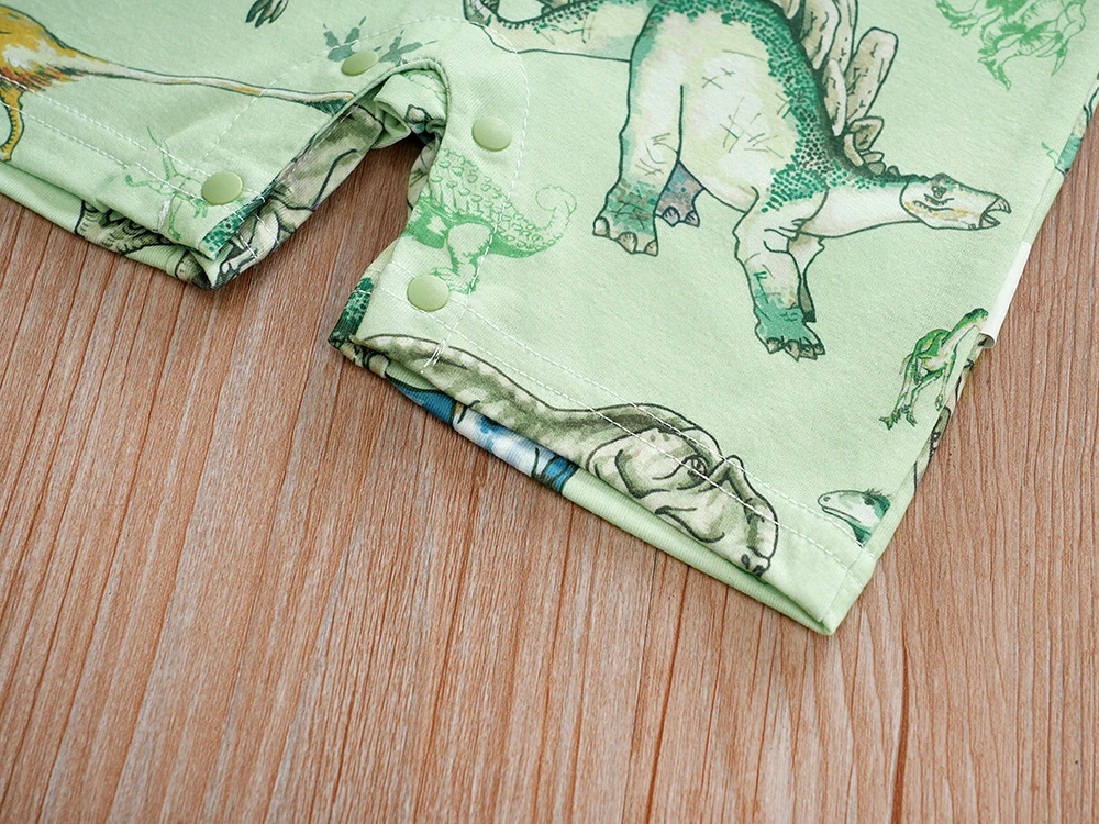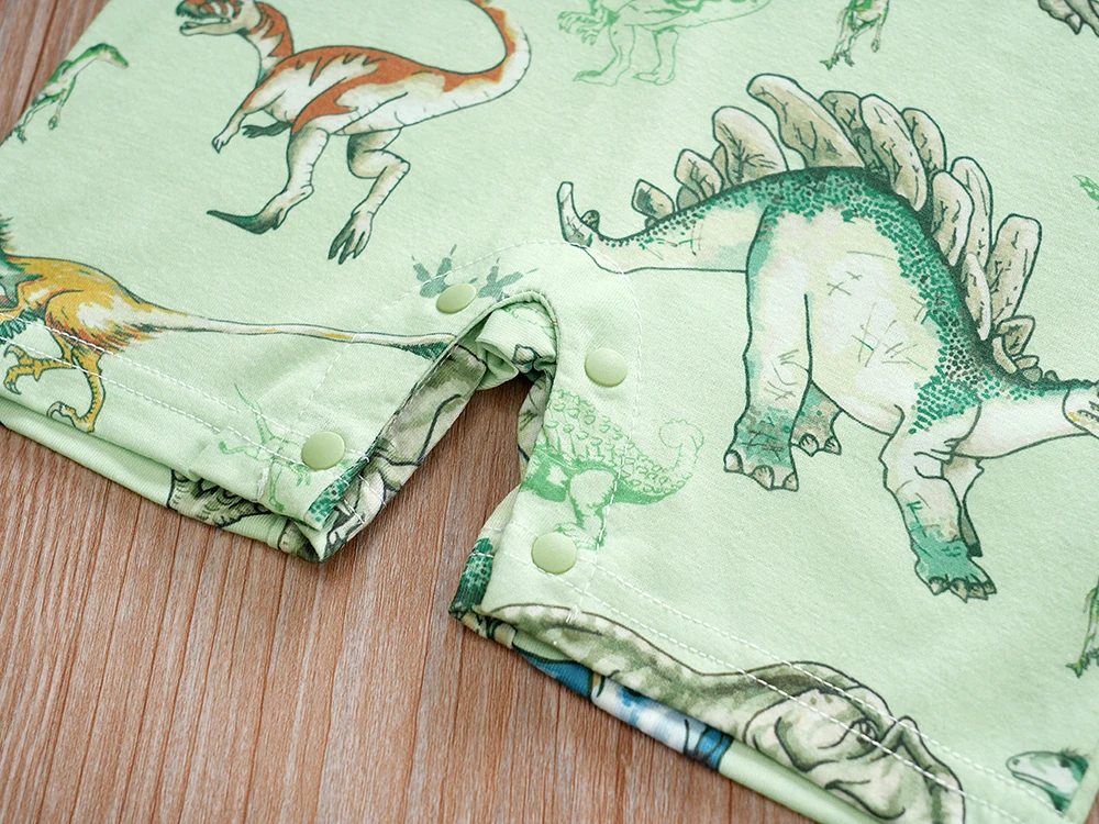 A soft and breathable dinosaur-printed romper designed for newborn baby boys, perfect for summer wear with comfort and easy button closure.