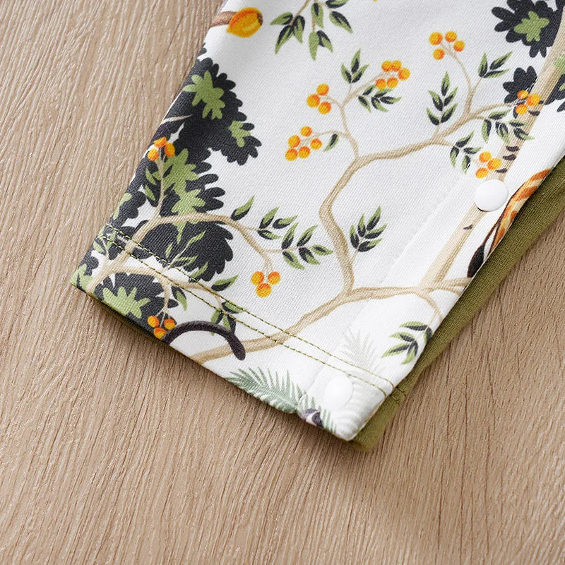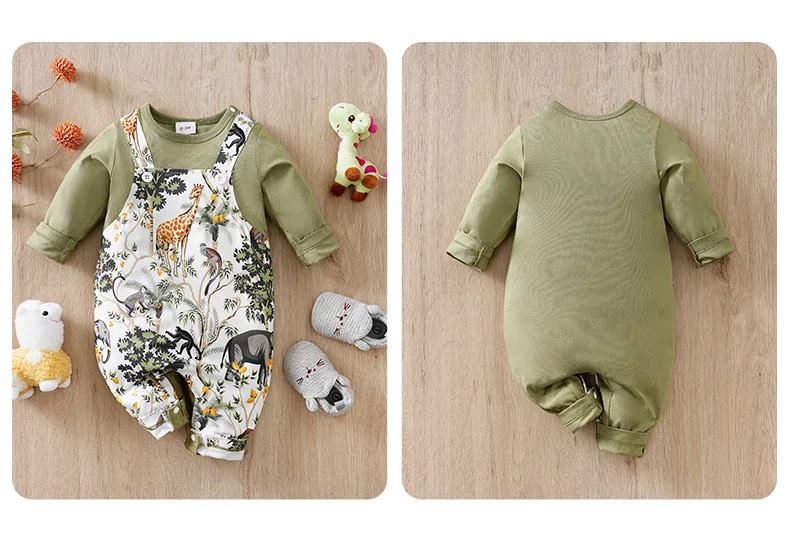 Cozy and breathable baby jumpsuit with forest animal prints, crafted from soft cotton. Perfect for spring and autumn wear for both boys and girls.